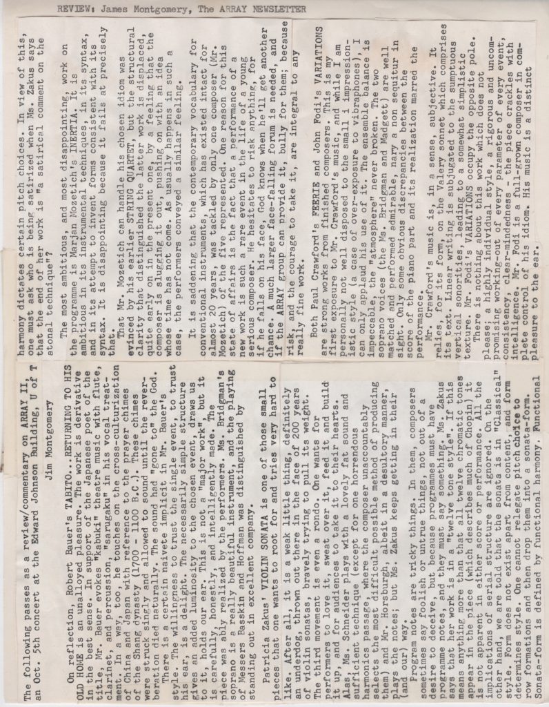 • Array Performance Archive Reference | Thursday 5th October, 1972 — ArraymusicII+A Premiere of Canadian Works